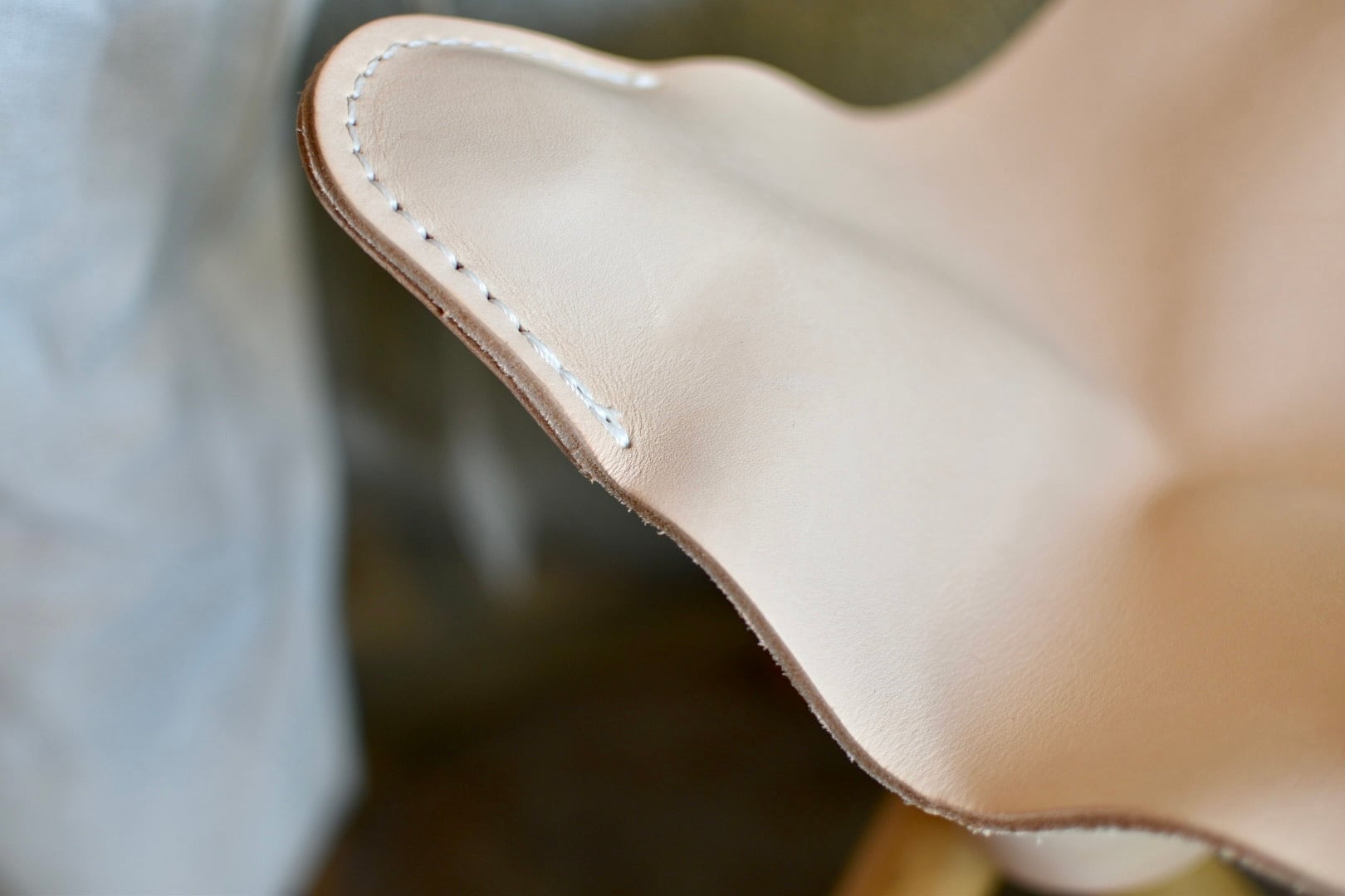 ※最後の画像はヌメ革(右側新品)が1年経って経年変化したチェアとの比較画像です。白っぽい革から徐々に茶色く変化していきます。